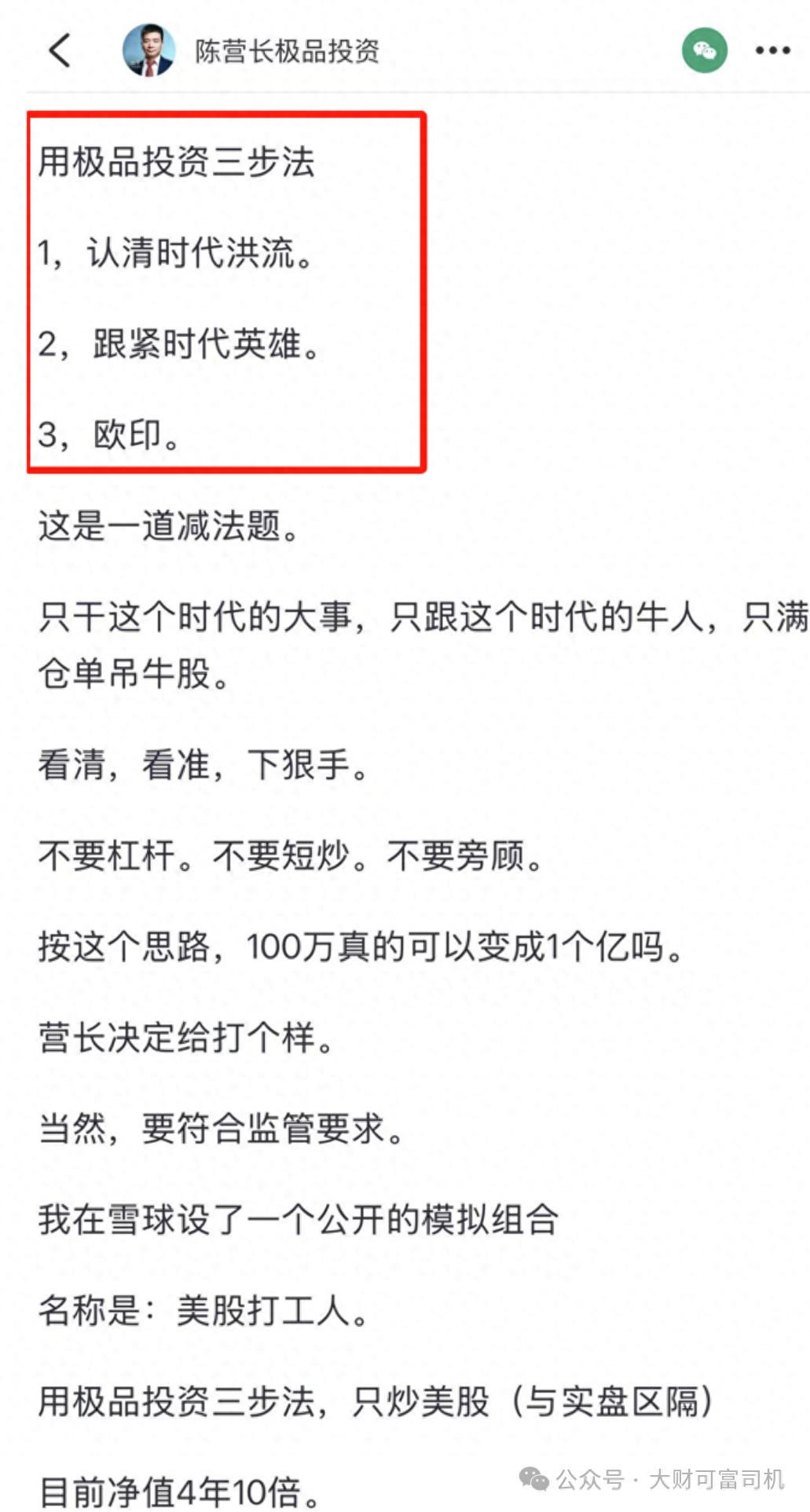 具体操作层面股票配资相关网址,陈宇的核心策略分为三步:第一、认清时代的洪流;第二、跟紧时代英雄;第三、all in。