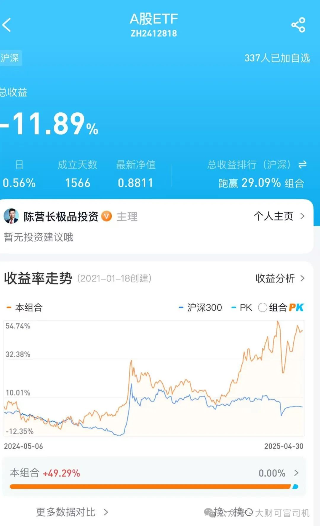 同期,陈宇还创建了一只\"A股ETF”的模拟组合,该组合从最初的分散持仓也变为集中持仓,2024年1月全仓港股通创新药ETF。但这一组合的收益远差于“美股打工人”,目前最新净值仅为0.8811。不过,该组合仍跑赢了沪深300指数。