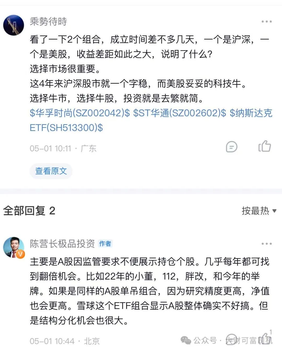 有网友表示:“两个组合成立时间差不多,收益差距如此之大,说明选择市场很重要,近4年来沪深股市就是一个字‘稳’,而美股妥妥的科技牛,选择牛市,选择牛股,投资就是去繁就简。”